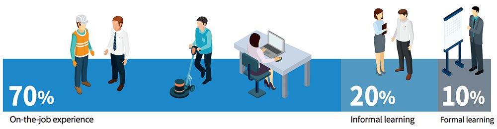 - 70%: develop new skills on the job through challenging and practical activities that stretch you and are key to continued development.